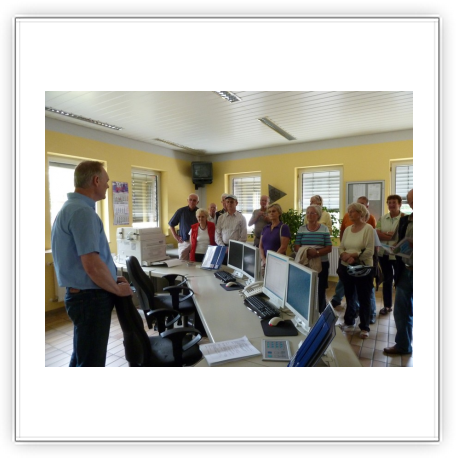 Aber auch den Spuren des Brauchwassers gingen die wissensdurstigen Senioren nach. Zwar durchliefen sie nicht persönlich die über 200 km langen Abwasserleitungen im Untergrund Niederkassels, ließen sich aber von Herr Seickfried alles genau an den Bildschirmen zeigen. Dort werden auch die Messsonden und damit die Vorgänge in den einzelnen Klärstufen überwacht: Die mechanische und die biologische Klärung in den Vorrats- und Rückhaltebecken. Neben der Schlammaufbereitung für die Landwirtschaft wird auch Biogas gewonnen. Am Ende der Reinigung fließt völlig klar aussehendes Wasser, das bis zu 90 % von Schadstoffen befreit ist, in den Rhein.